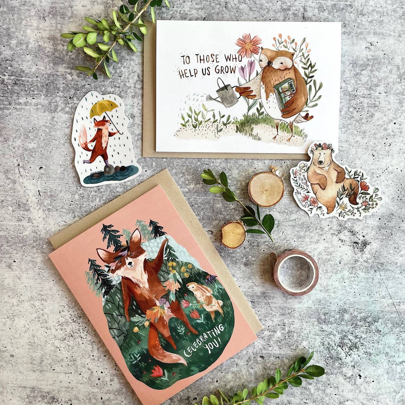 Tarjeta vertical de 13 x 18 cm, impresa en cartulina premium de 54 kg y con el interior en blanco para que escribas tu mensaje personal. Incluye un sobre kraft y se entrega en un empaque protector de celofán. Arte de Canyon & Cove.