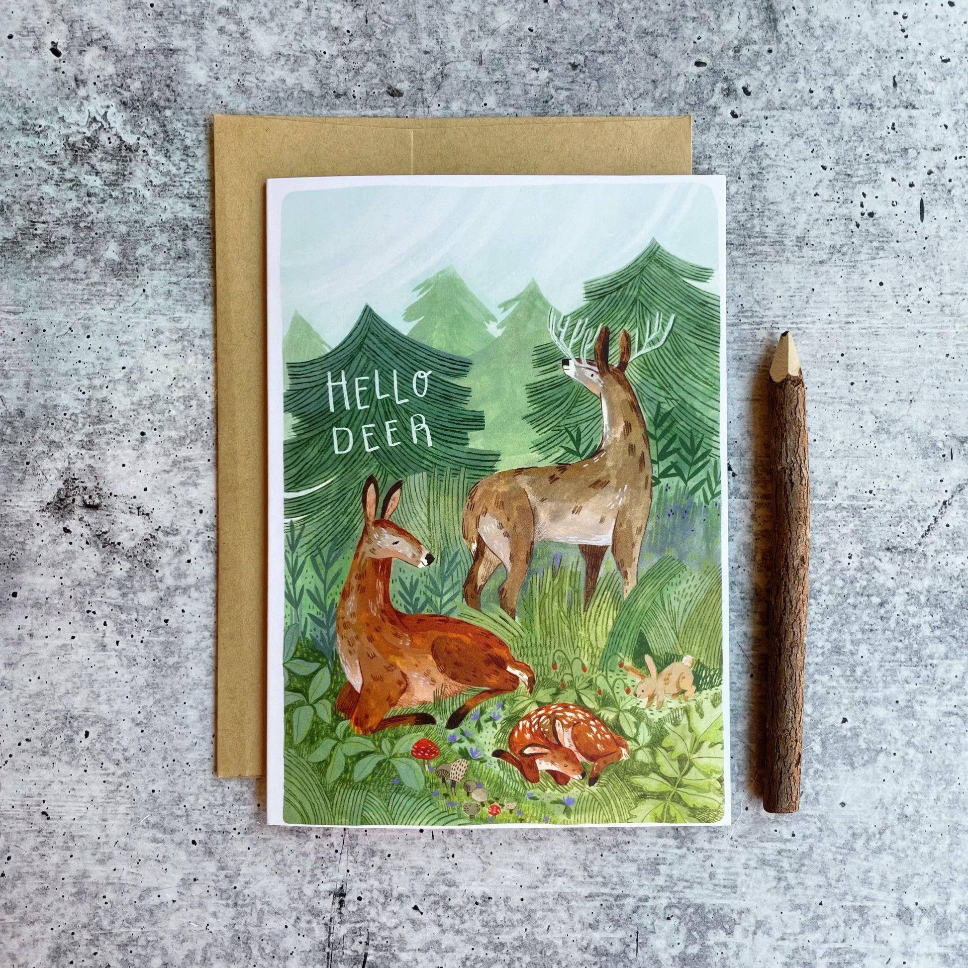 La tarjeta "Hola Ciervo" presenta a una dulce cierva y su cría acurrucados entre la hierba y los arbustos, con el padre vigilando. Si bien es perfecta para un recién nacido o una tarjeta de felicitación, también es ideal para regalar a un amigo en una ocasión especial.