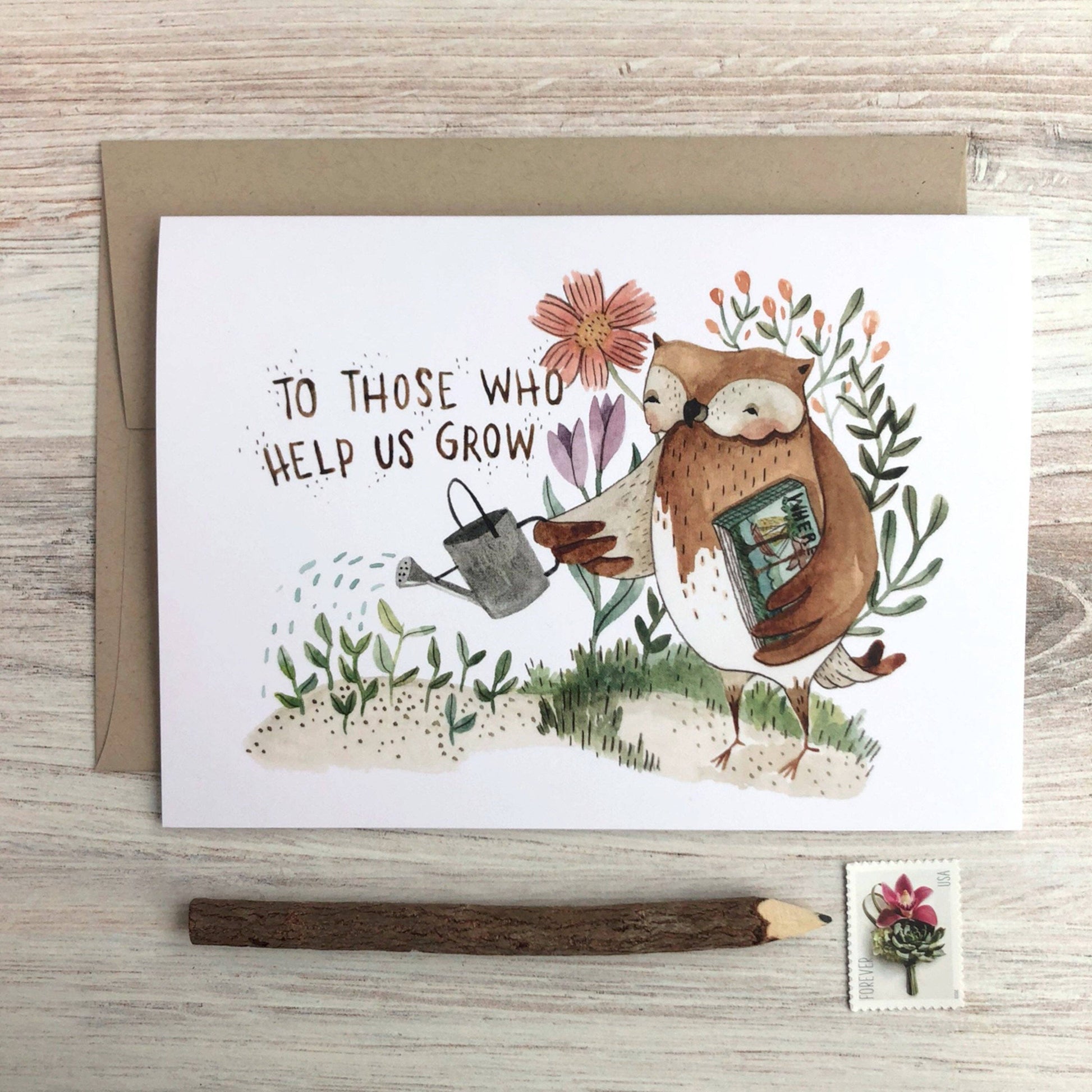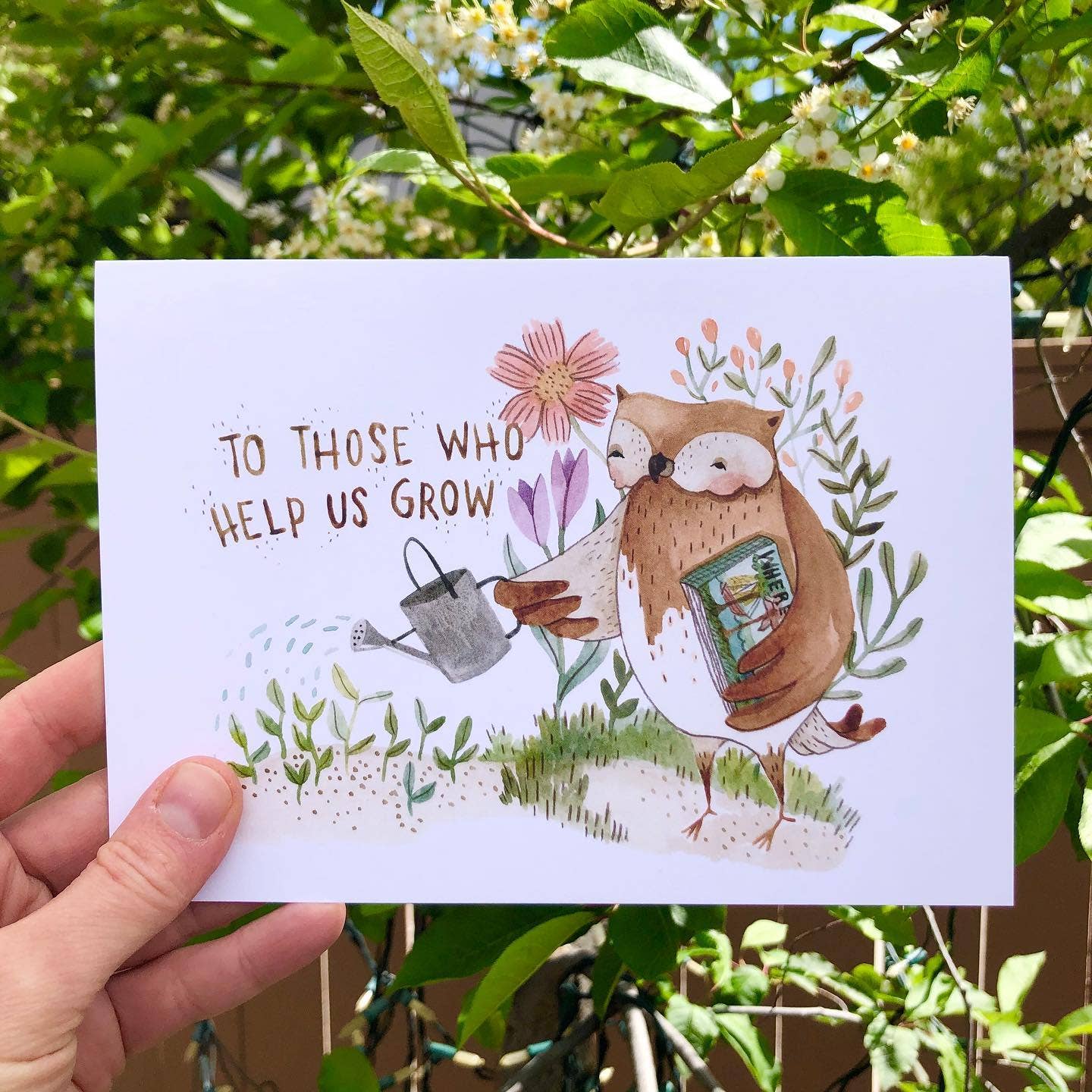 La tarjeta "Ayúdanos a Crecer" presenta un hermoso búho regando plantas en ciernes. Es una tarjeta ideal para cualquier maestro o persona que te haya ayudado a crecer de alguna otra manera. Arte de Canyon & Cove.