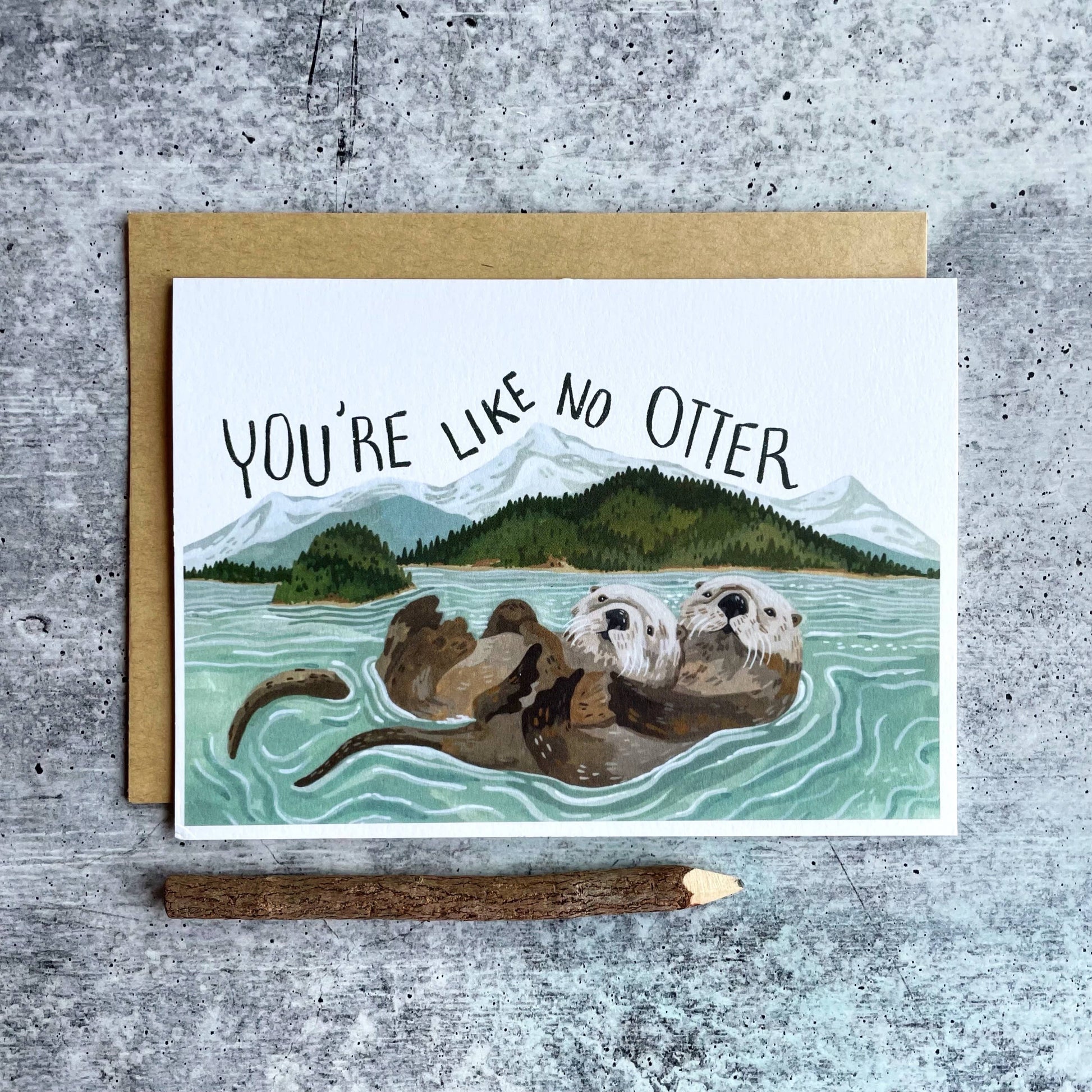 La tarjeta "Como Ninguna Nutria" presenta dos adorables nutrias tumbadas boca arriba en el océano frente a una isla con la frase "Como Ninguna Nutria" impresa. Las nutrias son adorables y esta tarjeta es perfecta para un aniversario, cumpleaños o cualquier ocasión especial para esa persona especial.