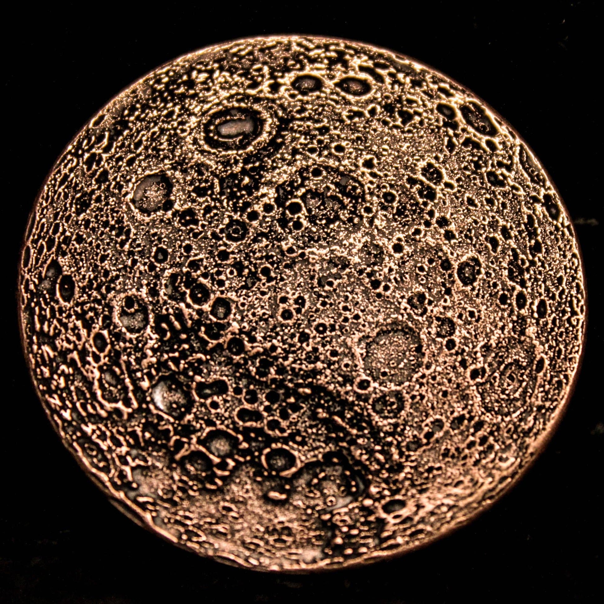 This coin of Earth's Moon features a geographically (technically it's selenographically) correct 136,794,240:1 scale design of the surface texture of both its near and far side. A great worry coin, gift, or reminder coin.