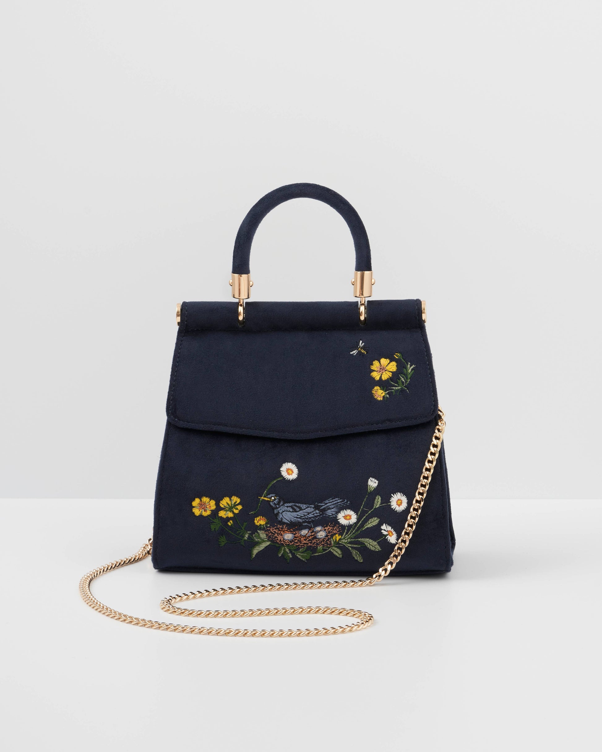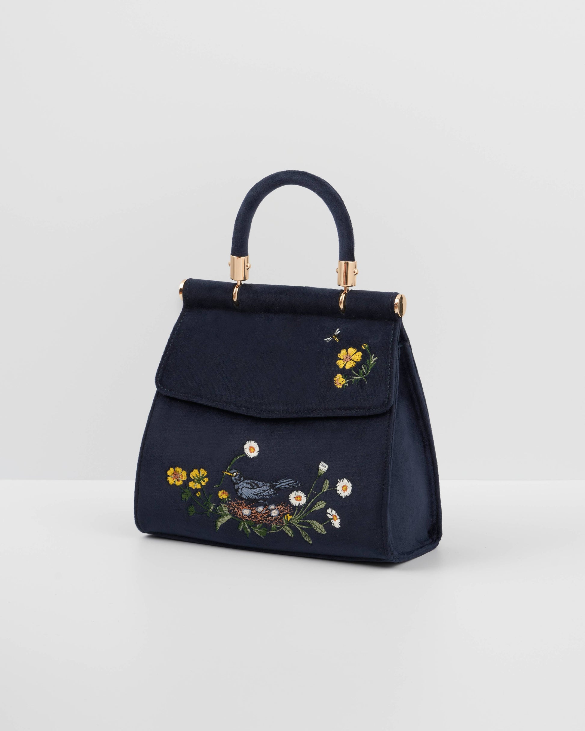 Unleash your inner free spirit with the captivating Blackbird Mini Velvet Tote, a true embodiment of artistry and charm. This petite powerhouse artfully showcases an intricately embroidered scene that breathes life into your accessory collection. The design features a lovingly depicted nesting blackbird, tenderly perched alongside four delicate eggs, all framed by an array of blooming flowers. Showcasing the Blackbird Mini Top Handle Purse alongside our other embroidered totes creates a captivating display that is sure to enchant onlookers.