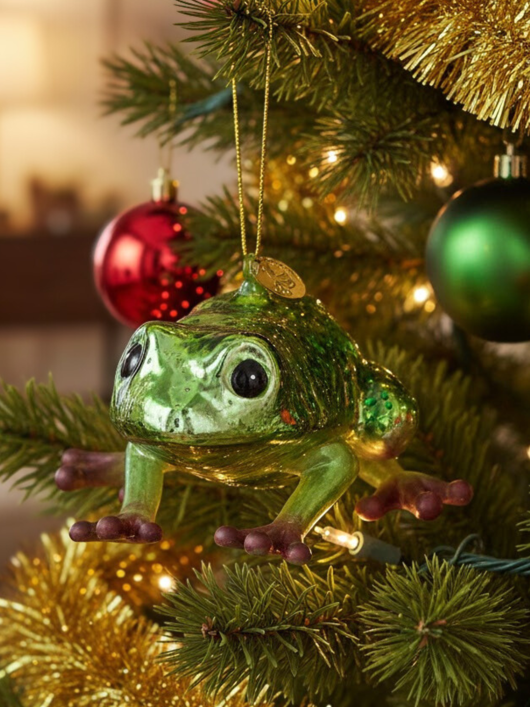 Crafted through time-honored blown glass methods, this green frog ornament exemplifies artisanal excellence. Each piece features hand-painted detailing that brings dimensional character to your holiday display. Beyond seasonal decoration, these ornaments function as lasting keepsakes, versatile enough for tree placement, mantle arrangements, or festive centerpieces. The combination of traditional craftsmanship and vibrant aesthetic ensures your collection gains a distinguished accent that transcends fleeting trends, establishing itself as a cherished element of your annual celebrations. Perfect for fans of frogs or nature lovers!