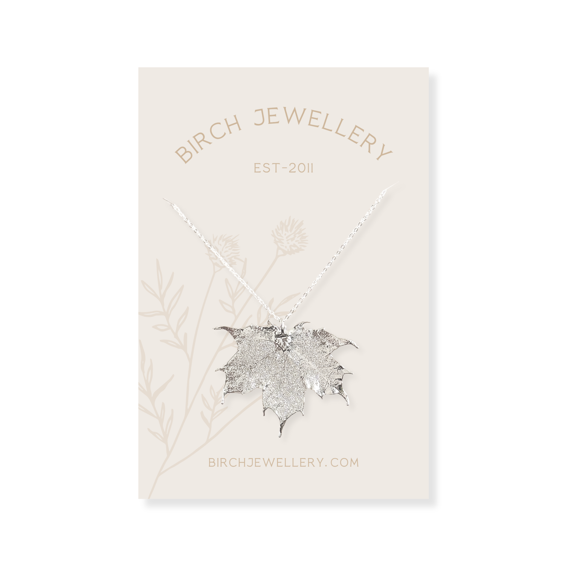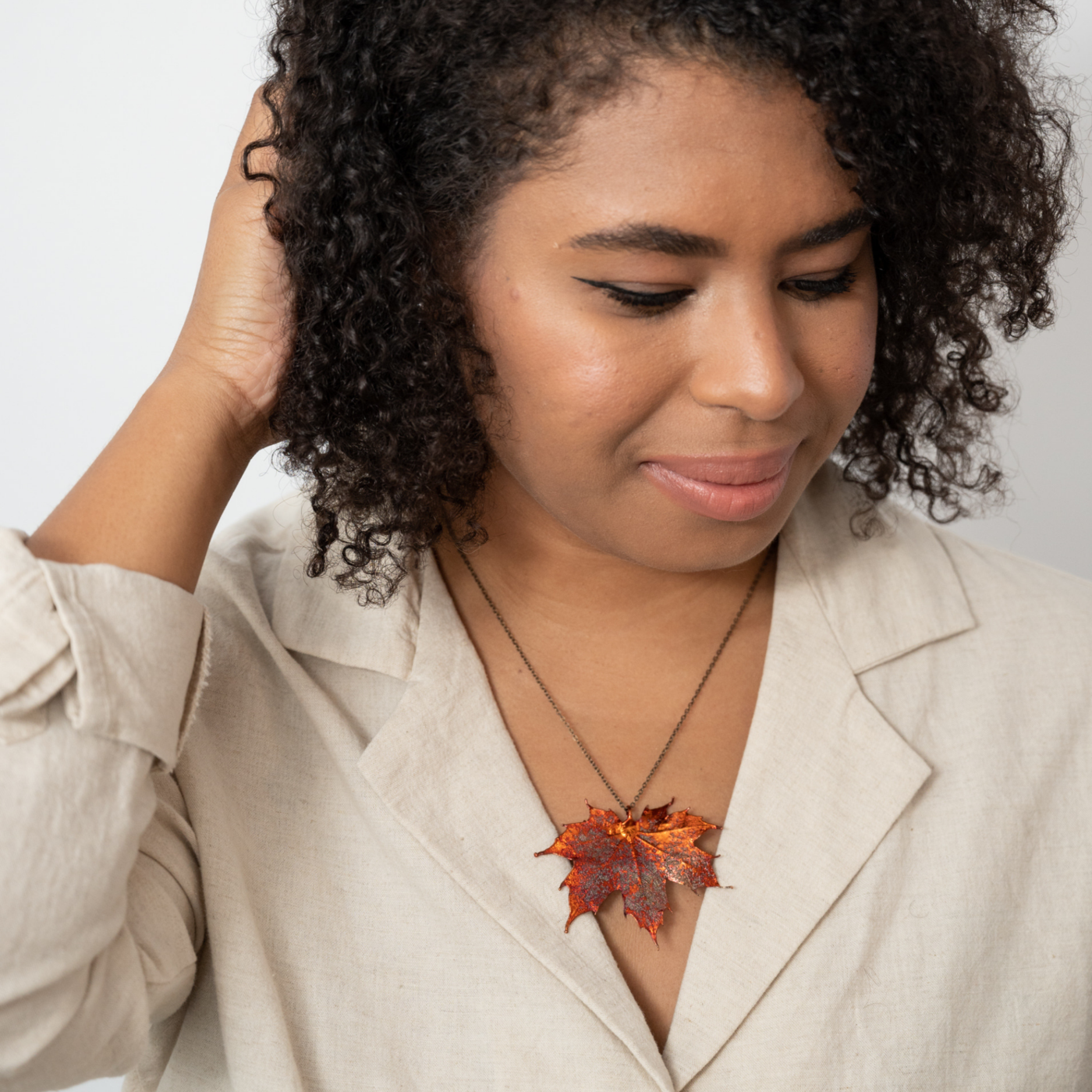 Each of these iridescent copper pendants are made with real maple leaves that have been hand-collected from the forest floor. Each leaf is dried and then coated in a metal layer to preserve its natural shape, creating a unique and one-of-a-kind piece.