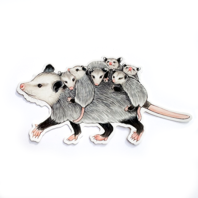This mom opossum might have a full load of passengers, but she’s not letting that slow her down! Measurements: approximately 4” This die-cut gloss vinyl sticker is durable, weatherproof, and perfect for water bottles, notebooks, laptops, bikes, and all sorts of other surfaces! Make sure to clean and dry the surface thoroughly before applying. Brand: Allison Stoiser Art